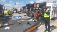 فيديو وصور- اصابة 5 اشخاص بجراح متفاوتة اثر انقلاب شاحنة قرب مفرق ايال