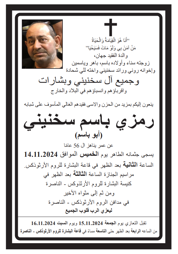 توفي في الناصرة، رمزي باسم سخنيني (أبو باسم) عن عمر ناهز الـ56 عامًا، وسيسجى جثمانه الطاهر غدًا الخميس، الساعة الثانية بعد الظهر في قاعة البشارة للروم الأرثوذكس في المدينة.
