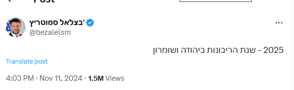 في وقت لاحق، نشر سموتريتش تغريدة على منصة "إكس" جاء فيها: "2025 هو عام السيادة في يهودا والسامرة"، في إشارة واضحة إلى هدفه بفرض واقع جديد في الضفة.