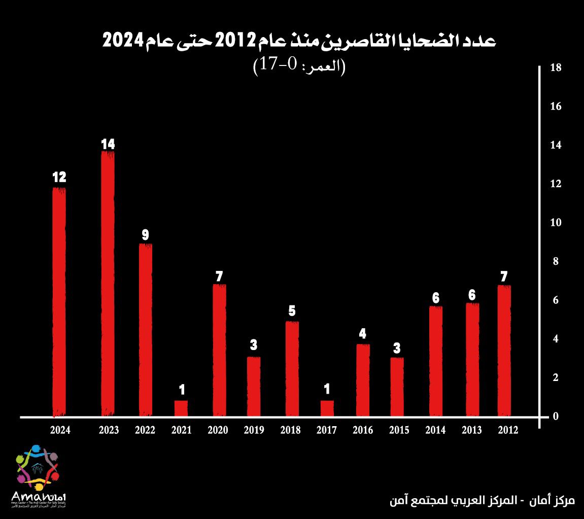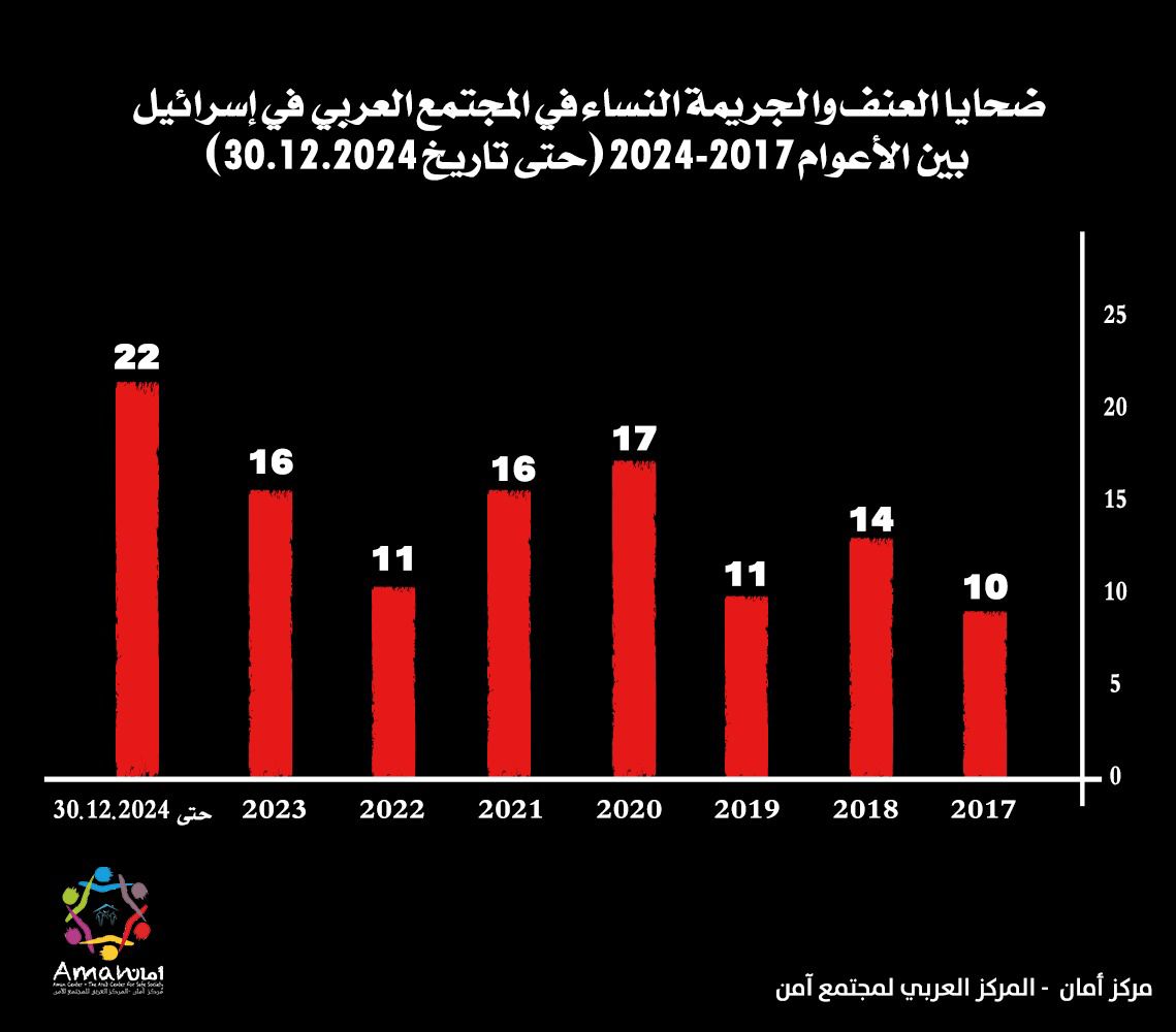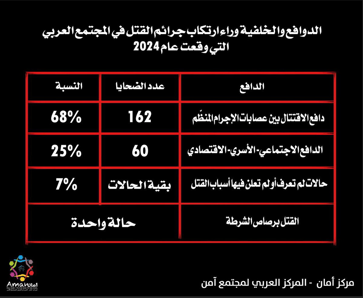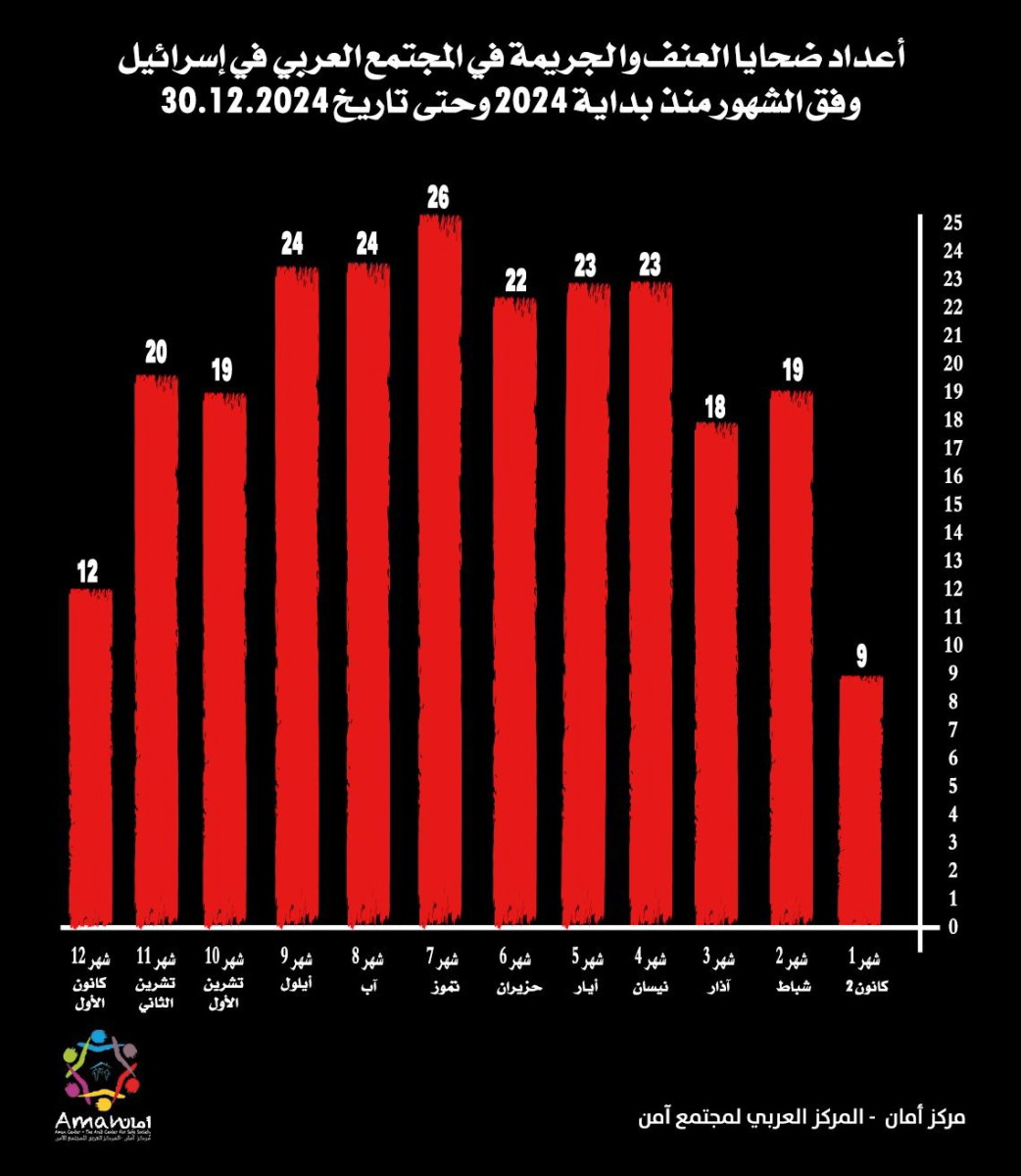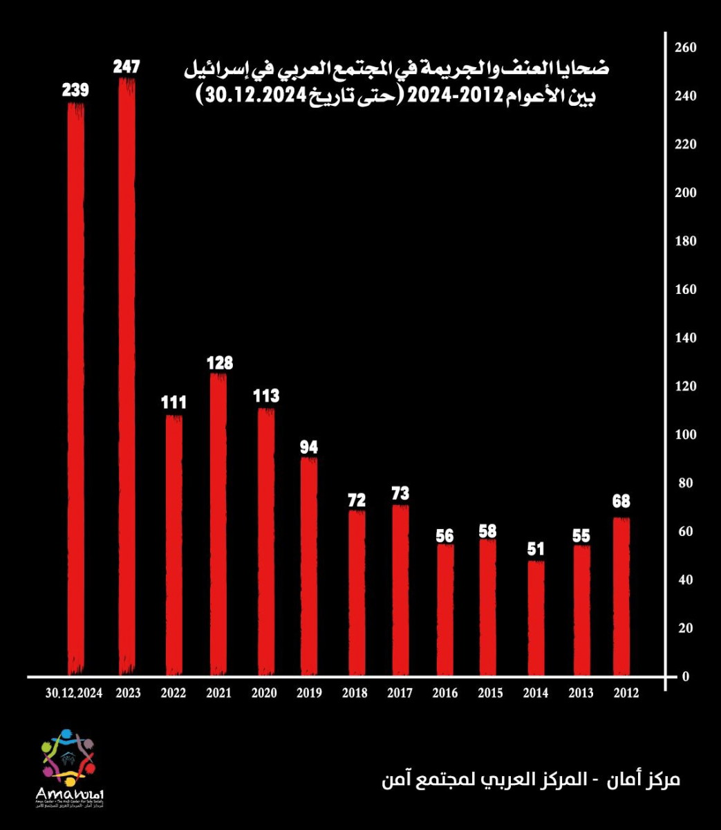 كشف مركز أمان – المركز العربي لمجتمع آمن في تقريره السنوي لعام 2024 عن استمرار تصاعد ظاهرة العنف والجريمة في المجتمع العربي، حيث وصل عدد الضحايا إلى 239 قتيلًا بحلول 30 ديسمبر 2024، مقارنة بـ 111 ضحية في عام 2022، ما يمثل ارتفاعًا بنسبة 115%. كما قُتل في عام 2023 ما مجموعه 247 شخصًا، مما يعكس خطورة الوضع المستمر منذ العام الماضي.