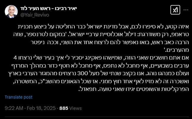 في ظل تفاقم العنف والجريمة في مدينة اللد ومقتل 4 أشخاص خلال اسبوعين منهم 2 في الـ24 ساعة الاخيرة، نشر رئيس بلدية اللد يائير رفيفو تغريدة على منصة X اليوم الثلاثاء:" يا له من أمر، أخبروكم، الدولة قررت تنفيذ خطة ترامب ولكن بطريقة محدثة، وهي على عرب اسرائيل من أجل ان يكون باستطاعتهم قتل بعضهم البعض !".لا احد يقنعني أنها ليست خطة الحكومة! امر غريب القتل مستمر ولا احد يحرك ساكنًا.