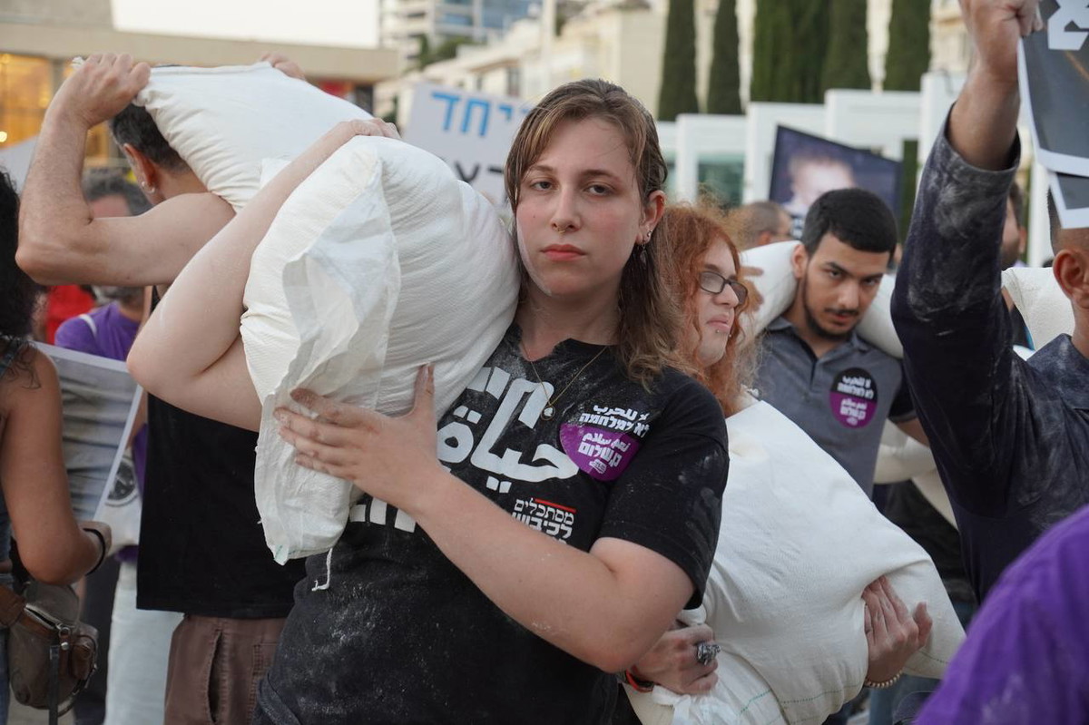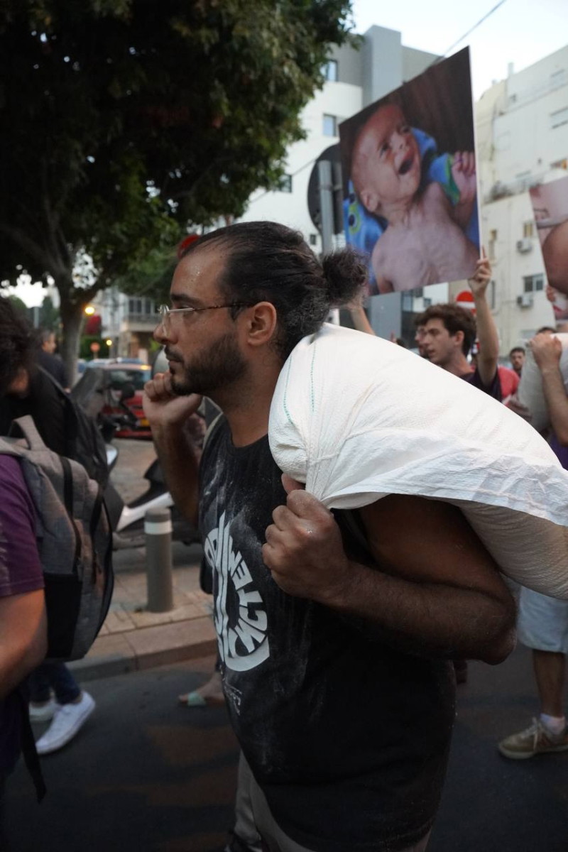 رفعوا أكياس الطحين وصور أطفال غزة| بتنظيم "نقف معًا" .. المئات في تل أبيب يتظاهرون ضد الحرب والتجويع