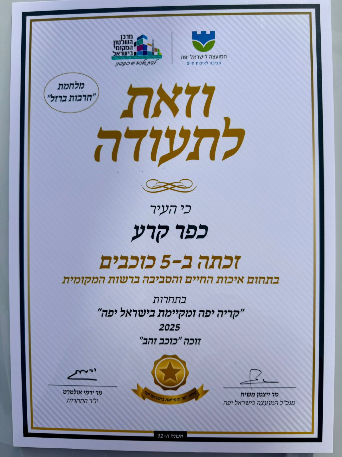 بلدية كفرقرع تحصل على جائزة "النجمة الذهبية" في التميز البيئي