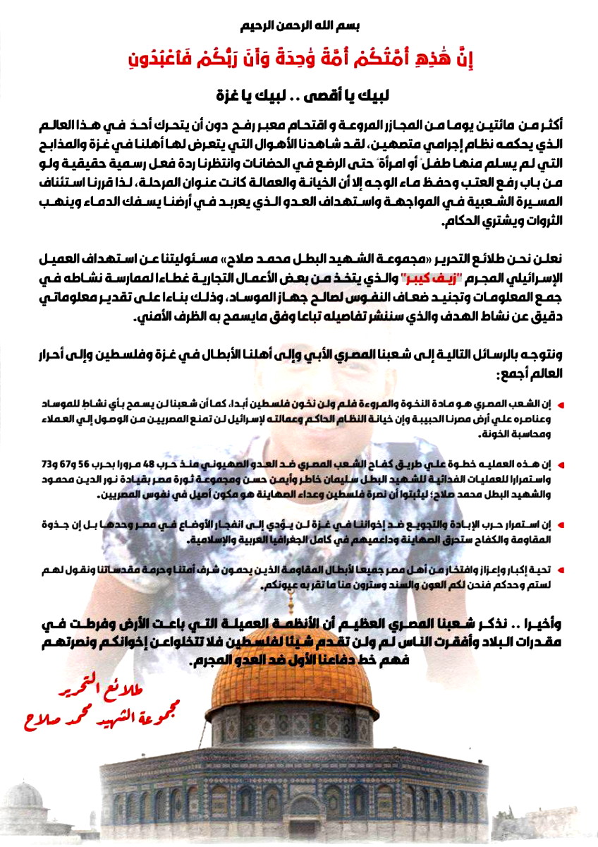 حسب مصادر، أعلنت مجموعة تطلق على نفسها اسم "طلائع التحرير مجموعة الشهيد محمد صلاح" مسؤوليتها عن قتل رجل أعمال إسرائيلي-كندي بالإسكندرية، حسب بيان متداول نسب للمجموعة في مواقع التواصل.